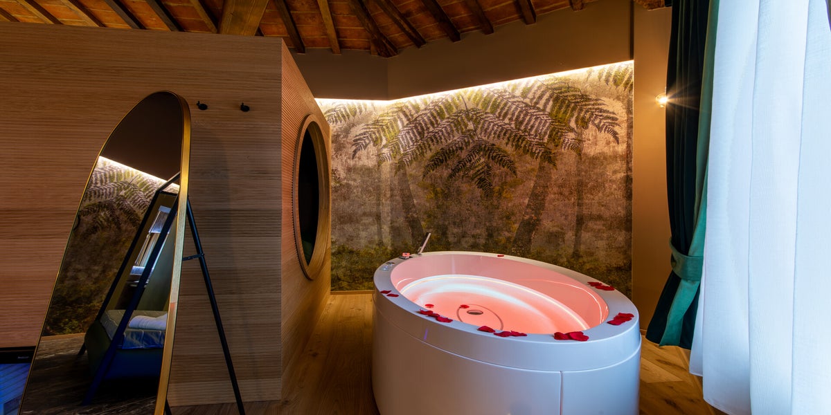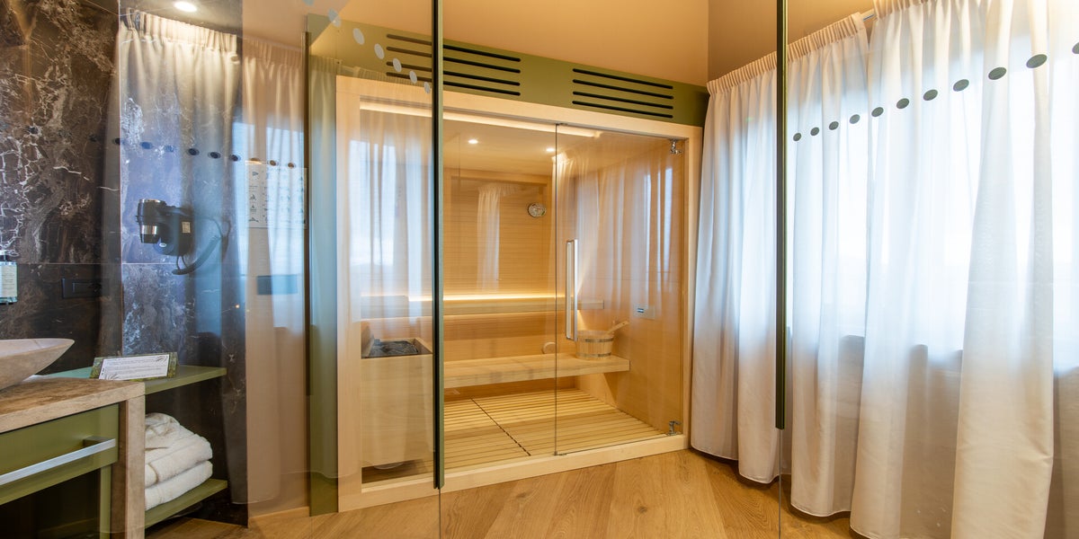 Camera spaziosa con vista panoramica, dotata di vasca idromassaggio con cromoterapia, sauna e relaxing chaise lounge.